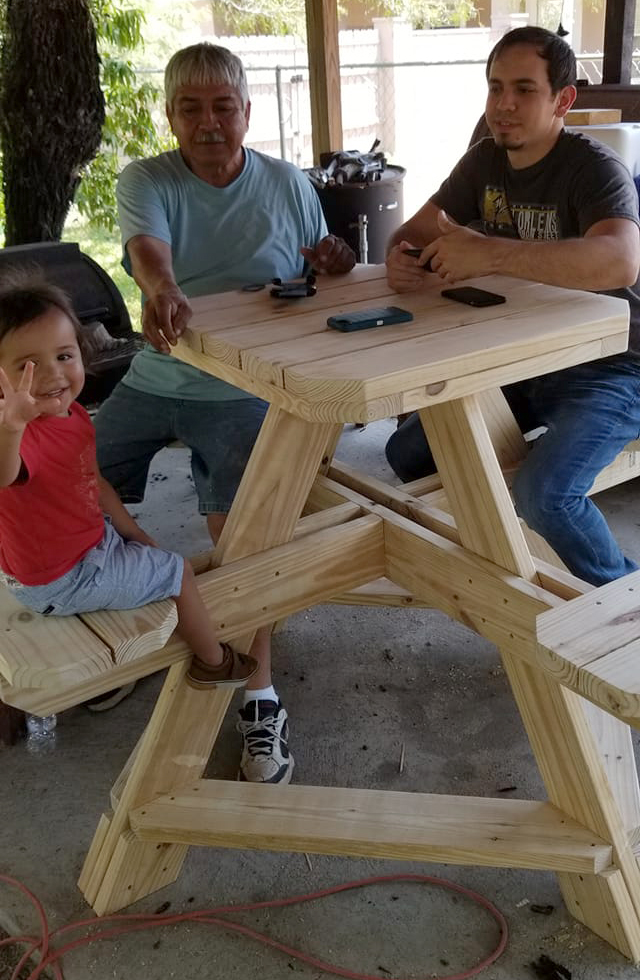 This tall, picnic table with connected bar stools is just one of the many types of outdoor furniture built by Alvarez A+ Construction. Functional and sturdy, this rustic table fits well in smaller areas, enhancing your outdoor space. Looking for custom built furniture? Text me a sample image of the piece you need!